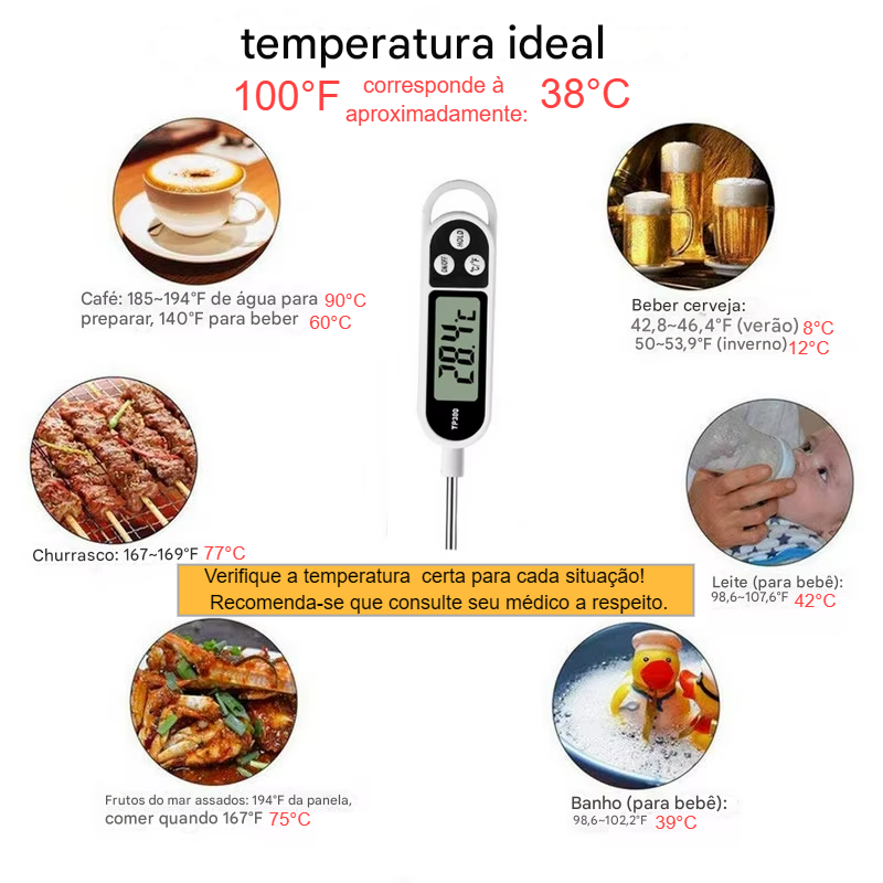A sonda de aço inox proporciona facilidade de limpeza e armazenamento, enquanto o visor LCD de alta qualidade fornece uma visualização clara da temperatura. 🔧